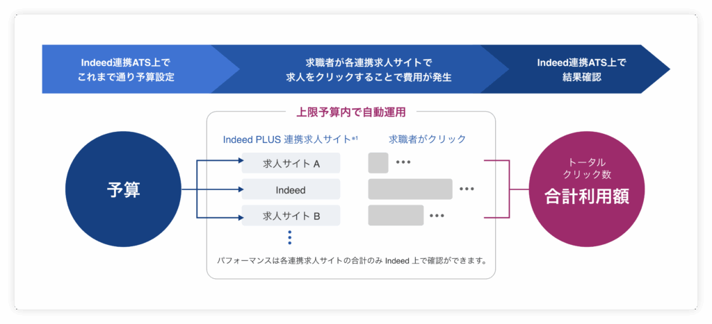 ※3Indeed PLUSは配信最適化の結果、複数ではなく単一の連携求人サイトにのみ掲載される場合があります。掲載対象となる連携求人サイトの種類や掲載可能時期は変更の可能性があります。